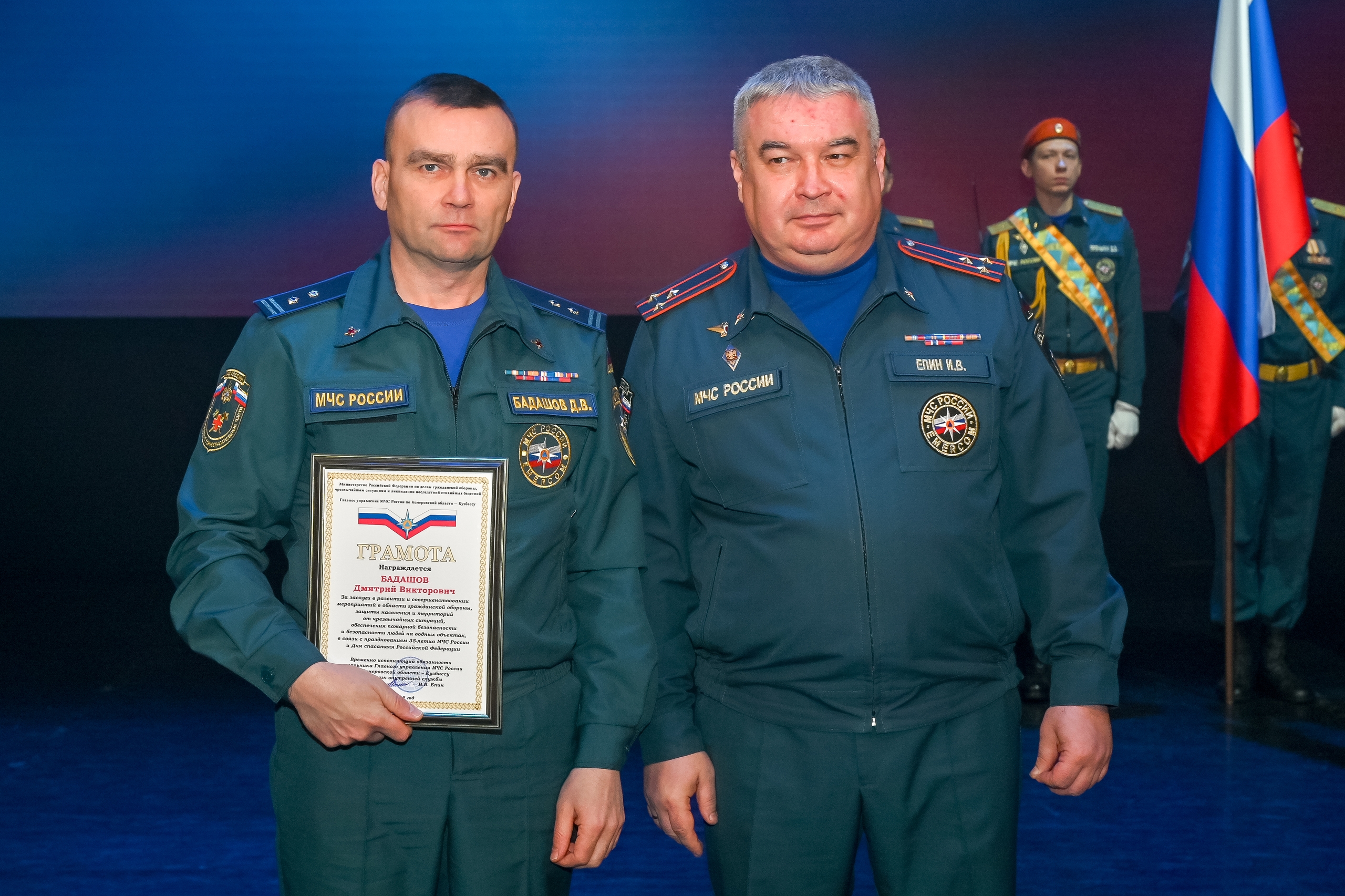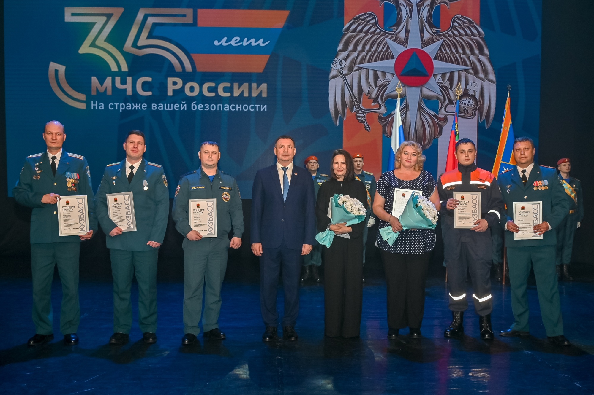 В ходе церемонии были отмечены заслуги тех, кто обеспечивает безопасность населения. За весомый вклад в реализацию государственной политики в области гражданской обороны, защиты от чрезвычайных ситуаций и пожарной безопасности Почетной грамотой Губернатора Кузбасса и Грамотой Главного управления по Кемеровской области – Кузбассу были удостоены сотрудники горноспасательной службы: