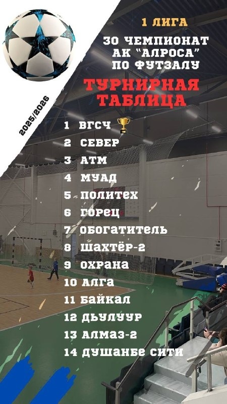 С 29 сентября 2025 года по 8 февраля 2026 года во дворце спорта «Кимберлит» АК «АЛРОСА» (г. Мирный, Якутия) проходили финальные игры 30-го первенства компании по футзалу. За право подняться в высший дивизион в I лиге боролись 14 команд, среди которых выступал коллектив филиала «Якутский ВГСО» ФГУП «ВГСЧ».